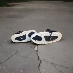 The product is a pair of women's Air Jordan 4 RM sneakers in black and light bone color, featuring a round toe, lace-up closure, and flat heel. They are designed for activewear and casual occasions, with a rubber outsole for traction. The shoes showcase the iconic Air Jordan logo as accents, and are part of a limited edition performance line. Made with a blended fabric upper and foam insole, these sneakers are perfect for basketball and other athletic activities. The mid-top shoe shaft style and retro theme make them a stylish and comfortable choice for young wearers.