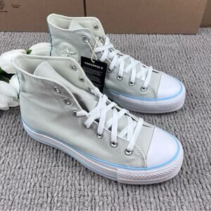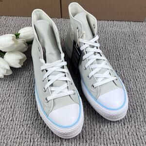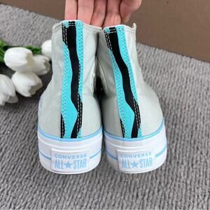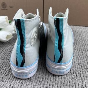 Upgrade your sneaker collection with these unique customized high-top Converse, featuring subtle yet striking blue and black details. The classic light grey canvas base is complemented by a soft blue stripe along the platform sole, while the back showcases a bold black and blue wave-like design for an eye-catching touch.
