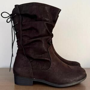 Calf Boots – Low Heel, Inside Zip, Slouchy Design, Tie /Lace-Up Detail on the Back