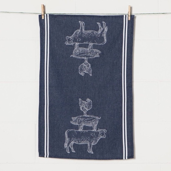 A cow, pig and rooster stack together on blue denim to create this whimsical and quaint towel that's perfect for drying dishes, wiping down counters or displaying for show. Made of soft, durable cotton and machine washable for easy cleaning.