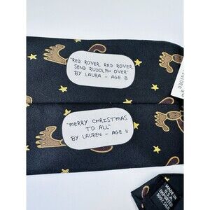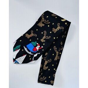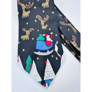 Add a touch of festive charm to your holiday wardrobe with this vintage Save The Children necktie, made in the USA. Crafted from 100% silk, this high-quality tie features a playful Santa Claus in his sleigh soaring over snowy rooftops with cheerful brown reindeer surrounded by gold stars on a black background.