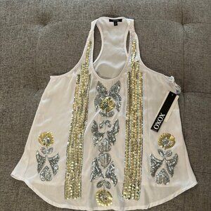 NEW with tags! Super cute xoxo tank top style blouse. Silver and gold sequins. Material is polyester.