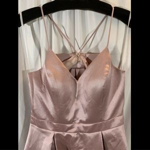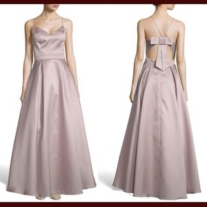 Look sweet as can be in this delicate long evening dress! Featuring a scoop neckline and spaghetti straps, ball gown skirt and statement keyhole bow back, this soft and pretty style is a keeper for events to come! Glam it up with strappy sandals and a pleat glitter flap clutch.