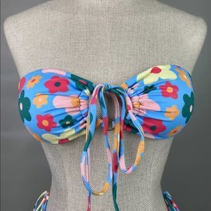 This bikini features a retro floral print and a style inspired by the 90’s. Top has a classic triangle shape, small o-ring details at center front and on each strap, and self ties at neck and back. Removable padding. Bottoms have the same o-ring details, stringy self ties, high-cut fit, and ruching for a customized fit. Cheeky coverage. Fully lined. Fits true to size: model is wearing a size small.
