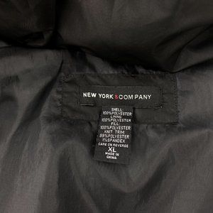 Description: The New York & Co Bomber Jacket has the thrills for holiday and winter styling for the outdoors, snow trips and love for galactic stars. NY&CO designed the jacket with a stand puffer collar, snap button closure with hidden zip up front, and two pocket zip up on an alternating star and geometric pattern in quilted for the exterior. The long sleeves has hidden ribbed cuffs. On the back of the NY & Co, there is slight pleat detailing above the ribbed hem of jacket. NEW YORK & CO | QUILTED BOMBER | PUFFER
