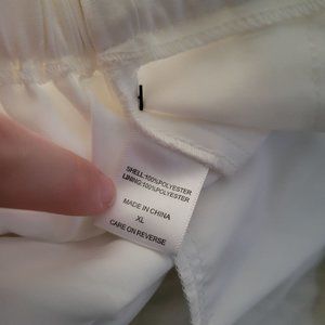 For sale is a pair of dress pants from New York & Company by Gabrielle Union. They are in new condition with tags attached but have 2 minor (untreated) stains on the bottom of the right leg and on the back of the left leg, please review all pictures. This white pair of dress pants are like a blouse material, they are lined on the inside and have a tie belt at the waist. The waistband is elastic along the backside for a comfy fit; they also have 2 pockets at the hips. Great for a business casual or office setting, going out to a nice brunch, or as a casual pair of bottoms for everyday wear in the spring and summer seasons. Tag reads $79.95 as the original price. Size x-large, approximate measurements: waist- 36-44", hips- 52", rise- 13", inseam- 26.5", outseam- 37", leg opening- 7" laying flat.