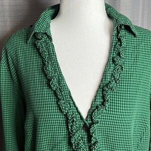 NEW YORK & COMPANY LARGE BLACK AND GREEN PLAID V-NECK BUTTON FRONT SHIRT