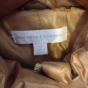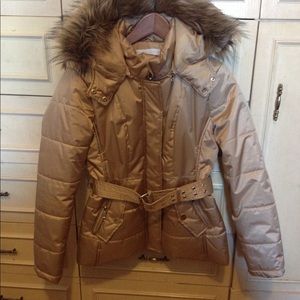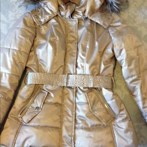 NEW YORK COMP. Gold color with silver details winter jacket silky texture of fabric feels soft to the touch it's a fitted style enhancing your silhouette, specially with belt around waist line. NEVER WORN, NO tags.