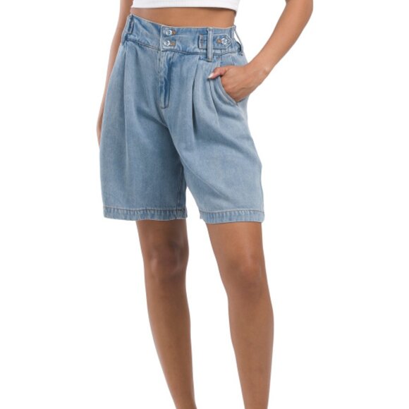 denim texture, pleat detail, button tab accents, elastic back waistband