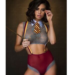 Cast a bewitching spell in this exclusive Brave Magical Student Fantasy lingerie costume featuring a sheer, grey lace crop top with a white collar, a sheer, burgundy high waisted panty with a grey lace trim, a cheeky cut back, removable burgundy and gold suspenders, and a matching striped tie. (Glasses and wand not included.) Grey lace design may vary.