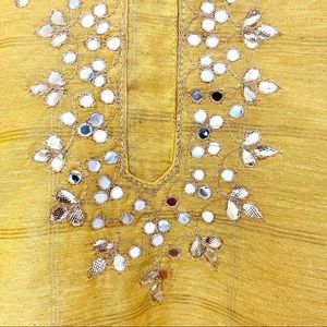 Brand new! Classy yellow ochre kurta with elegant mirror work. Perfect Indian clothing for Weddings /Haldi / Mehendi/ dinner parties / Pakistani events. Timeless classic style. Bought it just 2 months ago. Still tagged. Very comfy style. Pants & lining in soft cottony fabric. Can be tightened to fit smaller sizes.
