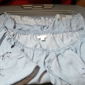 Light colored denim look top. Elastic around neckline, bottom hem & sleeves. Wear on or off the shoulder. Cut out details on the sleeves. 3/4 length sleeves.