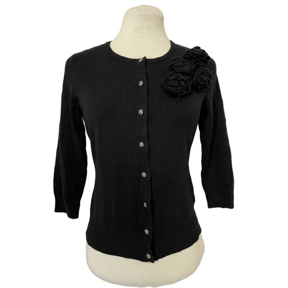 New York & Company Sweater: This beautiful retro style sweater has 3/4 length sleeves with a rhinestone button front which is perfectly adorned with a flower arrangement.
