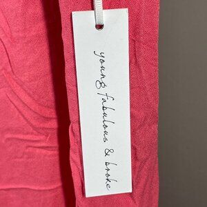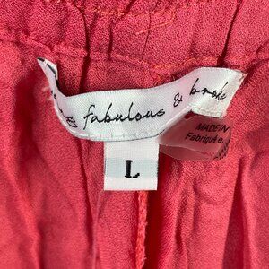YOUNG FABULOUS & BROKE PANTS! Condition: New With Tags Retail Value: $139 Size: Womens Large Details: -Brand: Young Fabulous & Broke -Material: Rayon -Material Type: Thin Woven -Color: Coral Pink -Pattern: Solid -Closure: Pull On -Pockets: No -Leg: Wide leg -Fit: Regular -Accents: Long Leg Slits, Elasticized Waist -Waist: 15.5 inches (unstretched) -Hip: 19.5 inches -Inseam: 29 inches (34 inches at longest) -Rise: 11.5 inches *measurements are approximate, taken laying flat* *minor signs of handling, no signs of wear* P-5