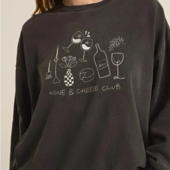 The Wine Club Sunday Sweatshirt by Z Supply Graphics features a charming Wine & Cheese club graphic embroidery. This relaxed crew neck sweatshirt has a vintage wash and is made from soft hand cotton fleece for an oversized fit. Crafted from 100% cotton brushed fleece, it offers cozy comfort and style.