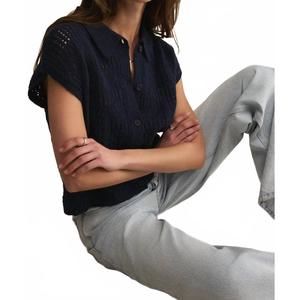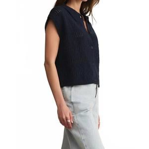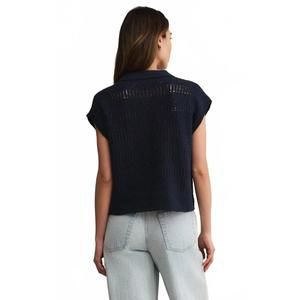 The Kinsley Cotton Sweater Top by Z Supply in Eclipse offers a chic blend of comfort and style, ideal for the minimalist trend. Made from 100% twisted cotton slub yarns, this sleeveless, cap sleeve top features a breathable open-knit texture and a collared neckline. It boasts a button closure and a distinctive crochet-inspired pattern with a drop shoulder for a modern, structured look. The garment measures 19" in length for size XS, increasing up to 20 1/2" for size L. Model is 5′8.5″ wearing size S with a bust of 30".
