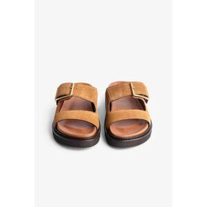 Suede sandal feature an adjustable strap with a gold metal C-shaped buckle. Adjustable strap. Cleated sole. Fabric: 100% Cow Leather. Platform 3cm. Made in Portugal.
