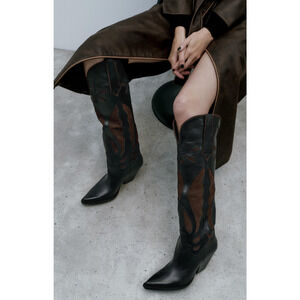 NEW ZARA BLACK BROWN LEATHER SUEDE COWBOY BOOTS SZ 39 8 8.5