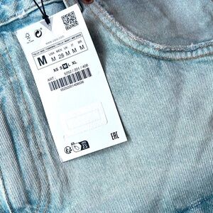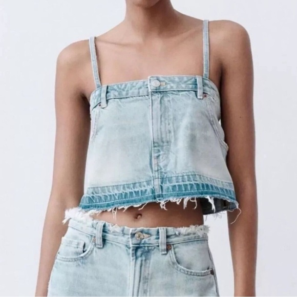 Denim top with straight neckline and spaghetti straps. It’s a super cute top that has all the features of a mini skirt including a button closure,belt loop, zipper, and front pockets. Finished off with a raw hem at the bottom.