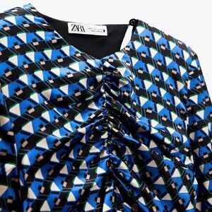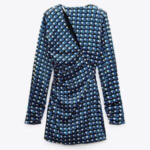 NEW ZARA GEOMETRIC PRINT DRESS BLUE LONG SLEEVE SHORT PLEATED WOMENS