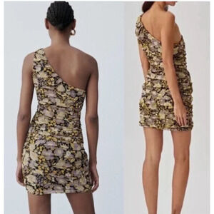 NEW ZARA M One Shoulder Metallic Floral Ruched Mini Dress in Gold/Purple $50 D53