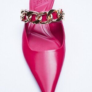 NEW ZARA MULES W/ METAL CHAIN DETAIL DARK PINK HEELED WOMENS SIZE 6.5