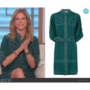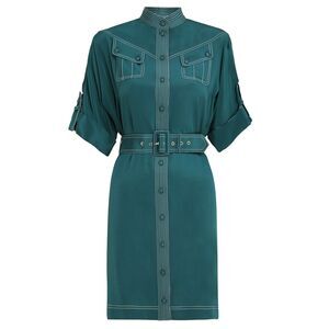Green silk stitch trim shirt dress from Zimmermann featuring a mandarin collar, a front button fastening, short rolled sleeves, two chest pockets, a belted waist and a short length.