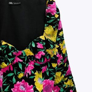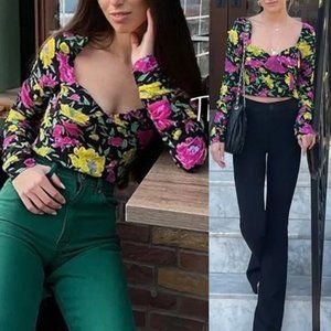 NEW Zara Floral Sweetheart Neckline Ruched Long Sleeve Crop Blouse Top L Vibrant