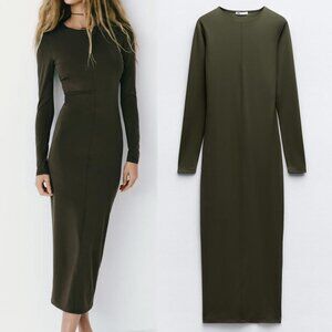 NEW Zara Olive Dark Green Fitted Polyamide Midi Dress S Sleek Stretchy Knit Slim