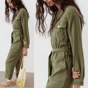 NEW Zara Olive Green Modal Long Sleeves Contrasting Topstitch Belted Jumpsuit S