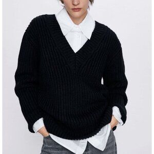 NEW! Zara Oversized Chunky Knit V Neck Sweater Black SZ S