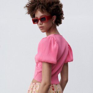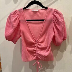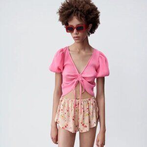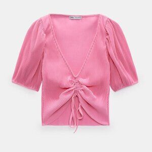 NEW Zara Pink Ruched Puff Sleeve Crop Blouse with Tie