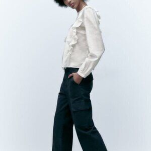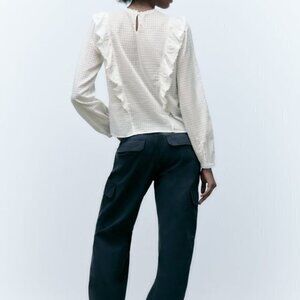 NEW Zara RUFFLED FLOWY BLOUSE Top Ivory Womens Size M Long Sleeve Embroidered