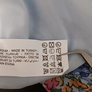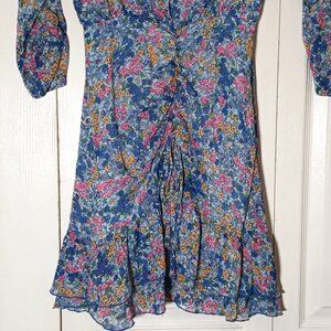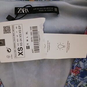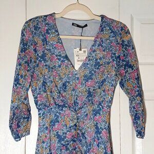 Keywords: Zara dress, floral dress, ruched dress, V-neck dress, blue dress, XS dress, spring dress, summer dress, casual dress, sheer sleeves, multi-color, lightweight fabric, Turkey-made, garden girl