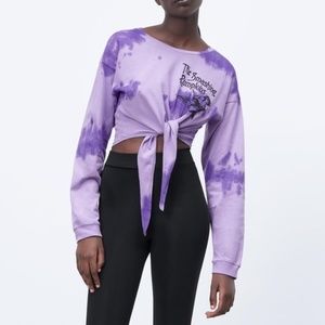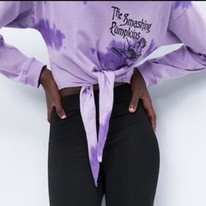 - Cropped, long sleeves, front knot detail (can be untied), tie dye, ribbed cuffs, ribbed neck, Smashing Pumpkins graphic on front, Smashing Pumpkins Mellon Collie and the Infinite Sadness graphic on back