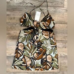 NEW Zara Tropical Print Cutout Strappy Linen Green Mini Dress 8054/528 Size M