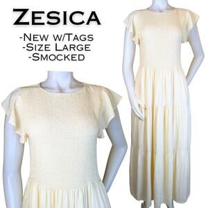 NEW Zesica Creamy Yellow Smocked Maxi Tiered Dress Flutter Sleeve Size Large