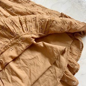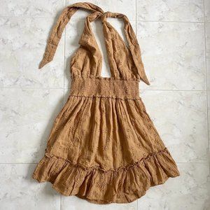 beautiful dress from aerie! eyelet pattern and halter neck are so summer, and it can be dressed up or down with cowboy boots or heels for any occasion. color is orangish brown