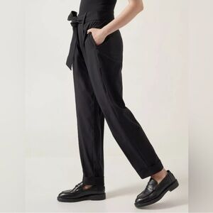 Semi-fitted, skims easily over the body Sits above natural waist Straight leg fits slim through the leg then eases up below the knee Waistband can be tied in knot or a bow for a custom fit Featherweight stretch made with recycled poly is light as air Recycled material Wrinkle resistant Secure pockets