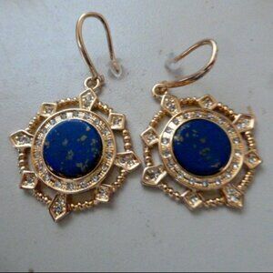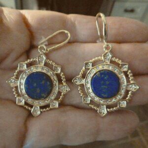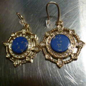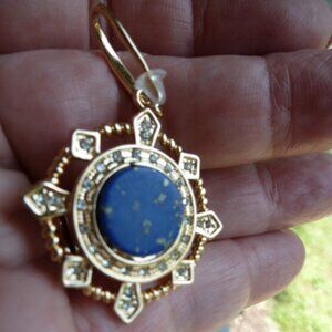 Round denim blue lapis lazuli stone is surrounded by a halo of white rhinestones and an intricate outer halo of shapes with rhinestones and corded connectors