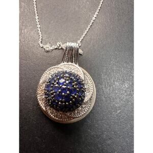 Genuine blue Madagascar sapphires prong set in an authentic 925 sterling silver pendant plated with rhodium. White accent stones around the halo are zircon. Sapphires are mined and heat treated for color enhancement. Total weight of pendant and chain is 7.39 grams. Total ctw is 3.35. Djoy. Made in India. Estimated retail value is $900.