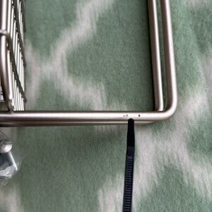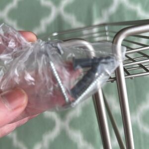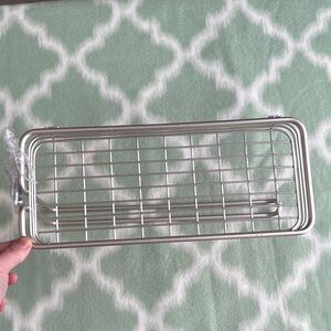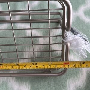 New never installed, it’s a metal wire shallow basket with a towel bar underneath, color is brushed nickel finish similar to stainless steel color, not chrome. The metal is high quality and sturdy, not the flimsy type. Has a couple tiny nicks in the finish in one bar, see photos. Can use in bathroom or kitchen or utility room. About 12” long 5” wide, a little over 5” tall. 1lb 5oz