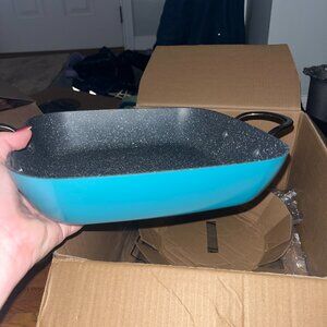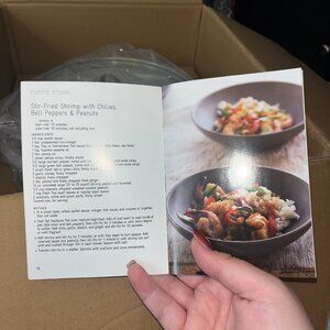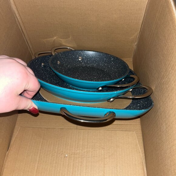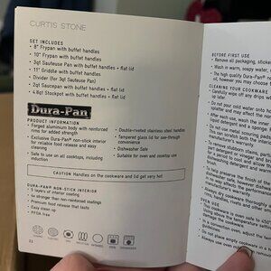 Curtis Stone 10 piece cookware set still in original packaging. Please look at pictures for size information. Comes with information booklet and recipes.