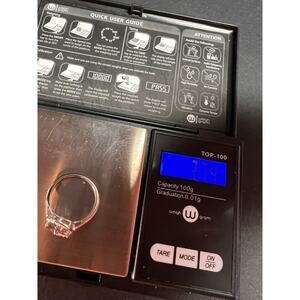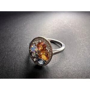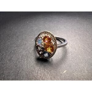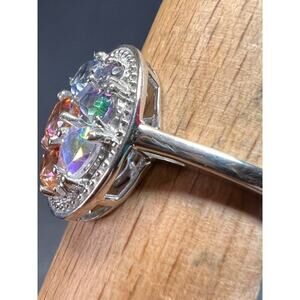 Genuine topaz gemstones in various shapes and mystic color treatments. Prong set in an authentic 925 sterling silver setting that’s plated with rhodium. Measures a size 8 and has a total weight of 3.74 grams. 2.20 total ctw. Djoy. Made in India. Estimated retail value is $320.