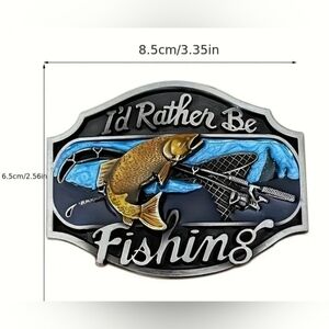 Show off your love for fishing with this stylish belt buckle. Featuring a vibrant blue and gold design, it's perfect for any fishing enthusiast.