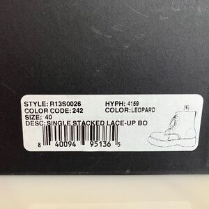 The product is a pair of R13 Leopard Print Stacked Boots in US size 9.5 and EU size 40. These boots feature a round toe shape, zip closure, and multicolor animal print pattern. The boots are lined and crafted with leather, with a rubber outsole for added durability. The boots are designed for women and come in a trendy design. Perfect for adding a bold and fashionable touch to any outfit, these boots are a must-have for any fashion-forward woman. In original box with dust bags.