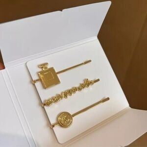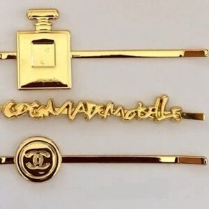 Elegant gold hair clips featuring iconic Chanel designs. Perfect for adding a touch of luxury to any hairstyle.
