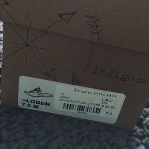 Brand new in the box! Denim knotted sandals from Francesca's. Brand is Indigo Rd, but sold by Francesca’s. Size 7.5, best suited for a narrower foot