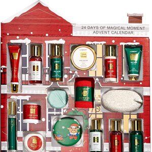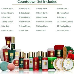 "countdown to christmas - countdown to the holidays with loved ones and share 24 magical moments of joy with our: bath bomb, body butter, perfume, scented candle, bath soap, hand wash, body lotion, bubble bath, lip balm, bath salts, rose soap, shampoo, shower steamer, body wash, body glitter, bath puff, pumice stone, nail filer, wash cloth, shower puff, pair cozy socks, hand cream, face wash and travel mirror"