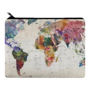 This makeup bag, zip pouch, and storage bag is perfect for your travels. With a unique design printed on only one side featuring a world map, this zippered bag is made of sturdy canvas and is ideal for organizing your cosmetics, pencils, and other accessories. In addition to being a practical zip pouch, this bag is multifunctional and allows you to carry your belongings with style and comfort.